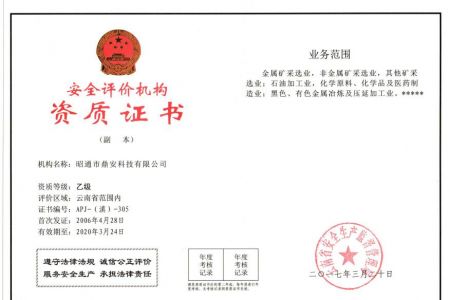 2003年11月10日,昭通市鼎安科技有限公司成立,初始主要從事第三方安全工程技術(shù)服務(wù),經(jīng)多年運營,發(fā)展為多專業(yè)綜合科技平臺,為社會提供多種專業(yè)技術(shù)服務(wù)工作。 現(xiàn)公司注冊資金為1200萬元,公司法定代表人:毛衛(wèi)旭。公司主要業(yè)務(wù):安全評價、安全標(biāo)準(zhǔn)化評審、安全工程技術(shù)服務(wù);環(huán)境監(jiān)測、職業(yè)衛(wèi)生檢測、檢驗;法律訴訟及非訴訟服務(wù);司法鑒定、固定資產(chǎn)投資項目節(jié)能服務(wù);工程咨詢;工程測量測繪;安全教育培訓(xùn)等。是安全生產(chǎn)服務(wù)、安全教育培訓(xùn)機(jī)構(gòu),也是環(huán)境監(jiān)測和職業(yè)衛(wèi)生服務(wù)機(jī)構(gòu),同時也是綜合的檢測檢驗、綜合科技平臺服務(wù)機(jī)構(gòu)。多年來為公、檢、法、司、軍、警、海關(guān)、仲裁、安監(jiān)、工礦商貿(mào)企業(yè)、社會團(tuán)體及個人提供多專業(yè)技術(shù)服務(wù)。